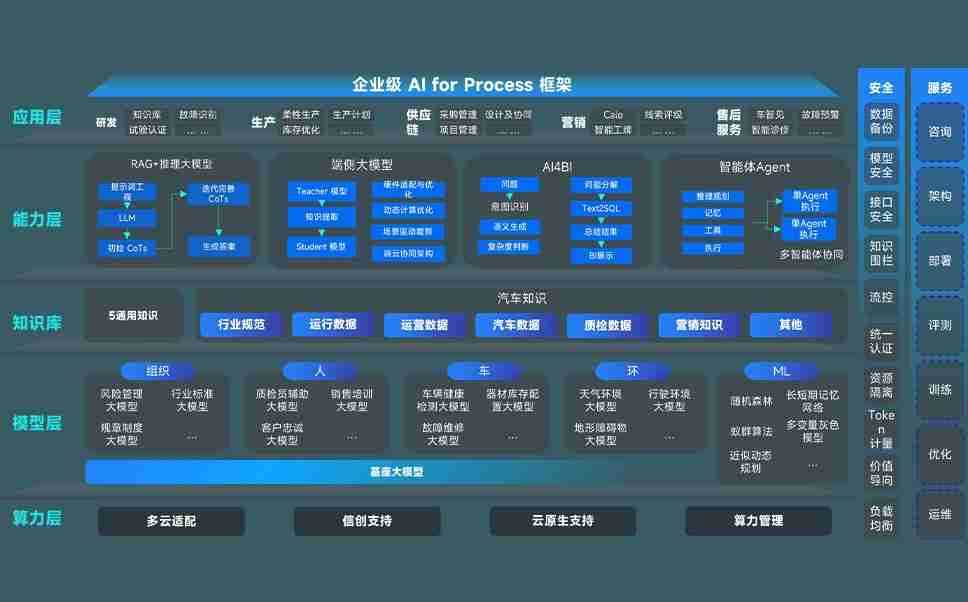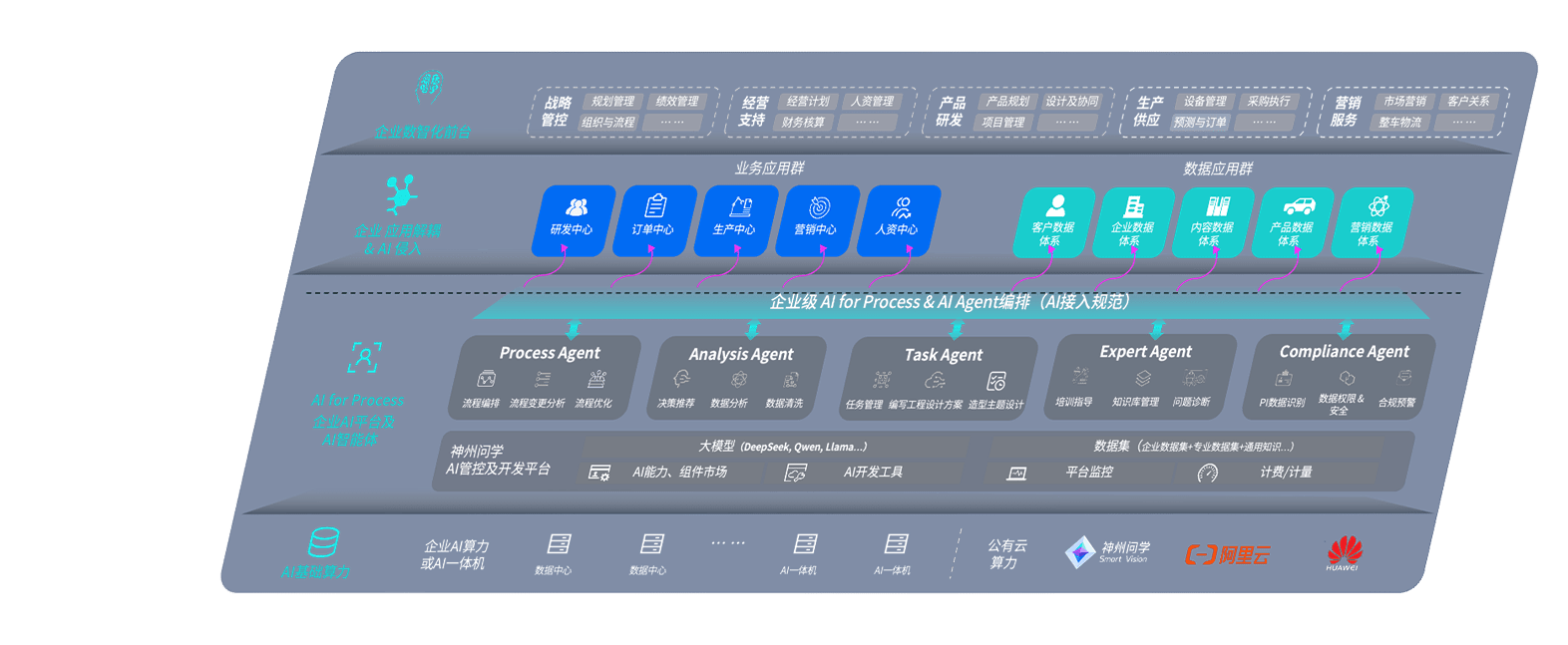 端到端的一站式AI工作空间深度融合了从企业战略规划到日常经营的全流程业务板块,,,定向解决车企内部领域多、、、、部门多、、链条长、、场景碎片化等难题,,支持车企快速构建以AI为核心的生产力写作体系,,实现任务执行与AI能力的无缝集成与交互