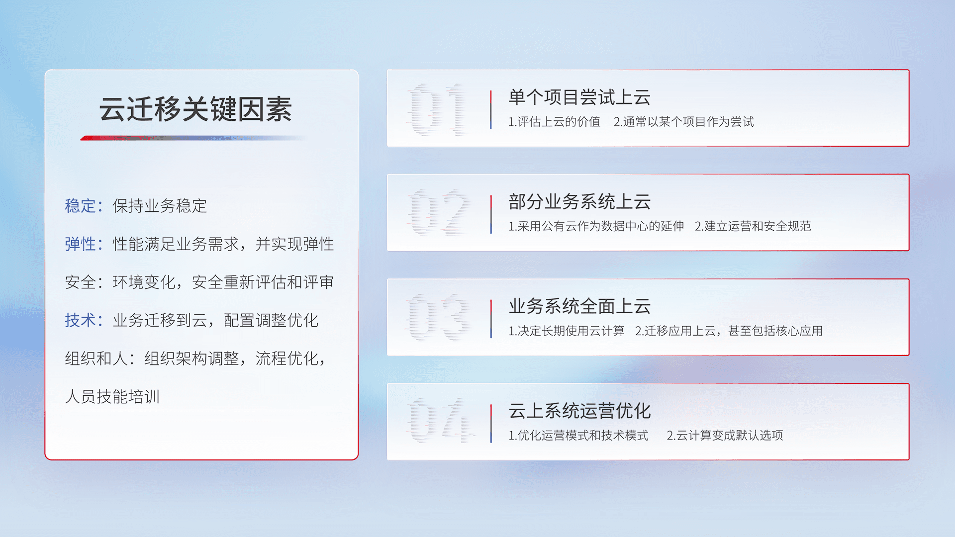 结合实际业务,,从规划设计、、云平台选型、、、云原生改造、、数据迁移、、集成交付,,,迁移全过程为客户识别最佳上云路径,,,做好风险识别管理,,设计网络架构、、、身份权限、、安全审计合规、、、、操作审计、、日志审计、、、监控告警策略、、、多站点容灾设计等,,对云上基础设施进行整体规划,,提升IT治理水平,,以满足弹性、、高可用、、、高性能的需求。。。