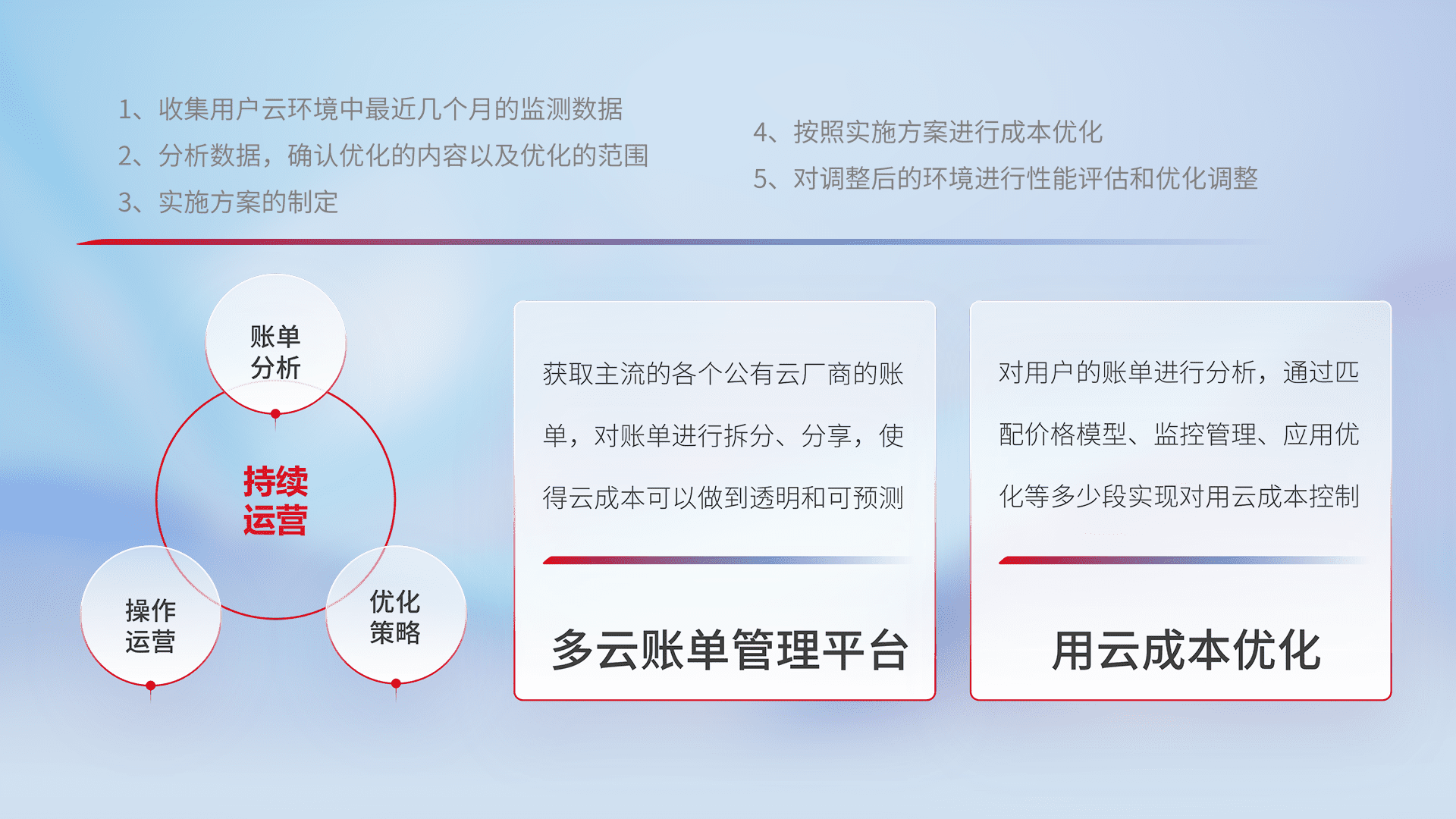 通过多云纳管,,以统一的资源数据模型把客户的云资源进行抽象和封装,,,进而实现对多云资源的统一操作,,,保障云资源管理的可靠性、、稳定性与可用性。。。。量身定制化运维内容,,配置、、、开发运维、、、、补丁管理、、、备份、、、监控、、、、认证和访问管理、、、审计和日常巡检等,,保障在用云过程中的可靠度,,,,稳定度以及高可用率。。。。